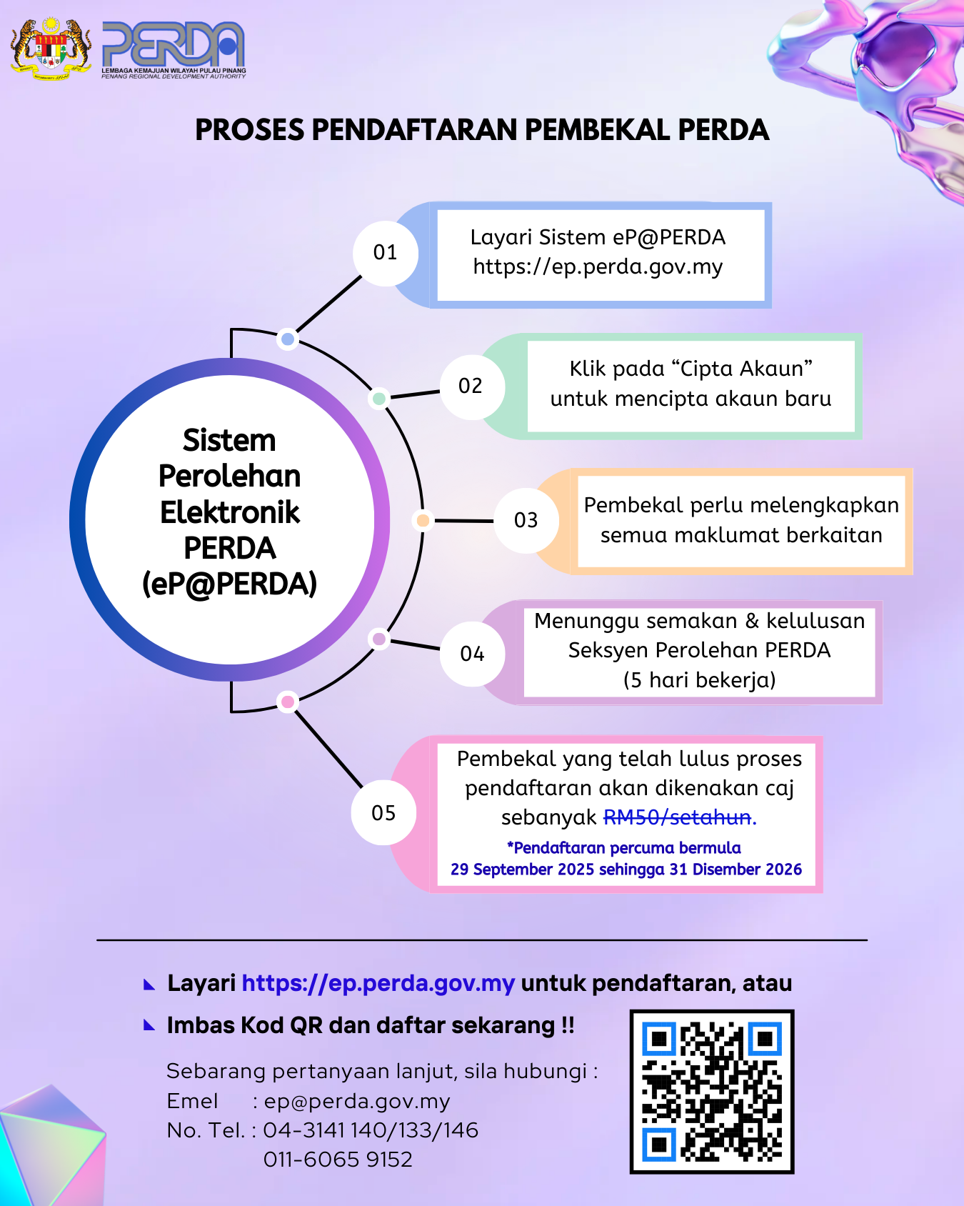 Dimaklumkan bahawa semua pembekal baharu dan sedia ada perlu mendaftar di Sistem Perolehan Elektronik PERDA (eP@PERDA) bagi menyertai sebarang perolehan PERDA.
